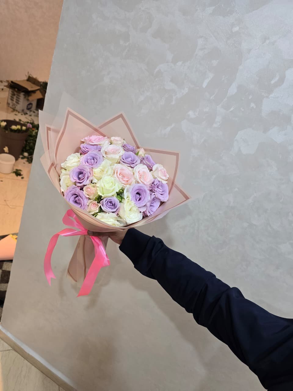 Un bouquet élégant de roses violet et roses, symbole d’amour et de tendresse. Idéal pour exprimer vos émotions avec simplicité et raffinement.