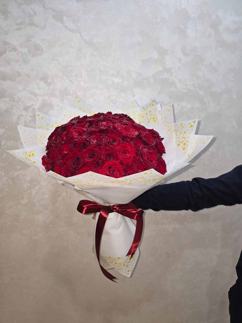 Ce bouquet somptueux incarne l’amour intense, la force et le prestige, idéal pour les grandes occasions, les demandes romantiques ou les cadeaux haut de gamme.