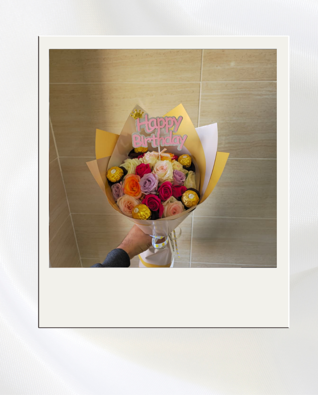 Happy Bouquet — Un bouquet joyeux de roses colorées accompagné de délicieux chocolats, parfait pour célébrer l’amour, l’amitié ou une belle surprise gourmande.